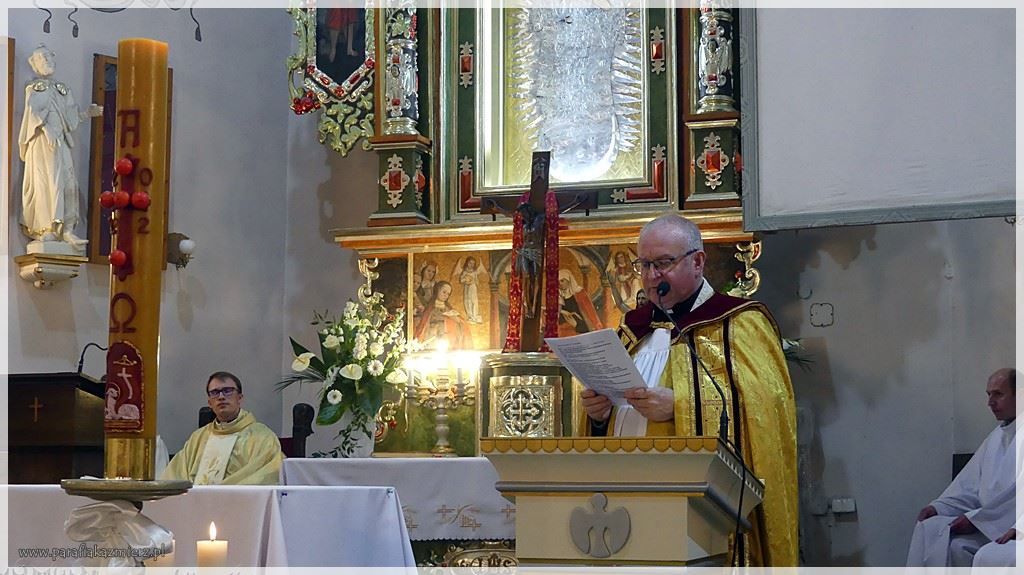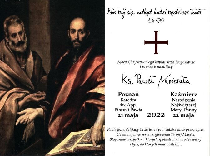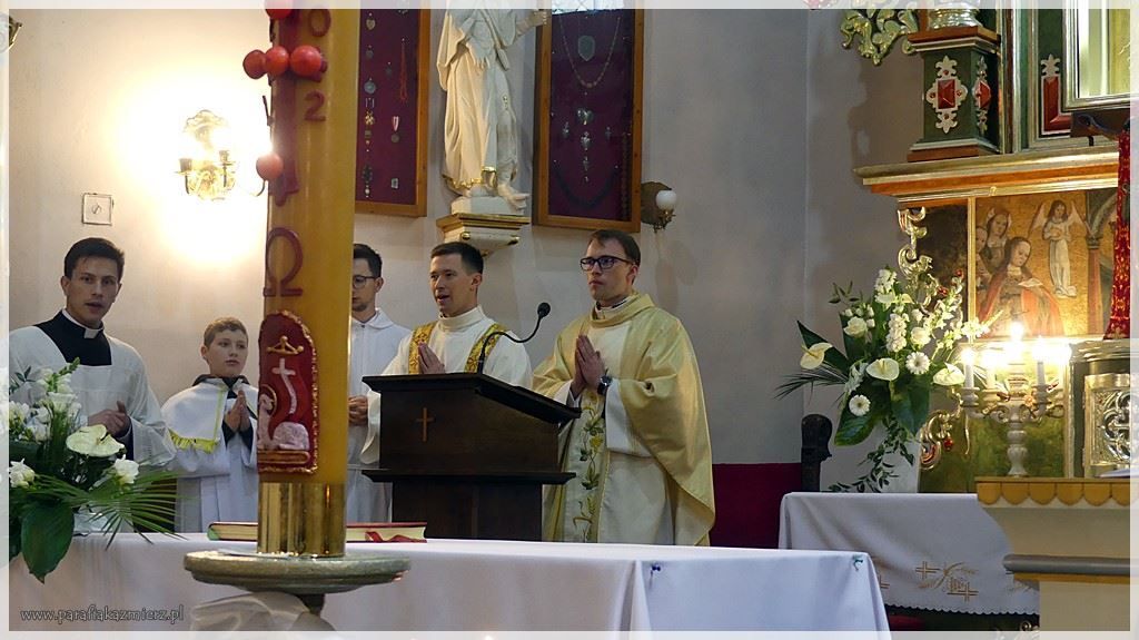 W niedzielę 22 maja swoją Mszę św. prymicyjną w rodzinnej parafii pw. Narodzenia NMP w Kaźmierzu odprawił ks. Paweł Napierała. Uroczystość poprzedziło błogosławieństwo rodziców na probostwie. Liturgię uświetnił śpiewem chór im. Stanisława Moniuszki z Kaźmierza pod dyrekcją Roberta Winieckiego. Na zakończenie mszy kapłan udzielił błogosławieństwa prymicyjnego, które w tym dniu ma wartość szczególną. Wiernym zostały rozdane obrazki prymicyjne, na których umieszczono wizerunki świętych Piotra i Pawła. Stosowne życzenia i gratulacje złożyły ks. Pawłowi delegacje różnych środowisk i tutejsi parafianie.