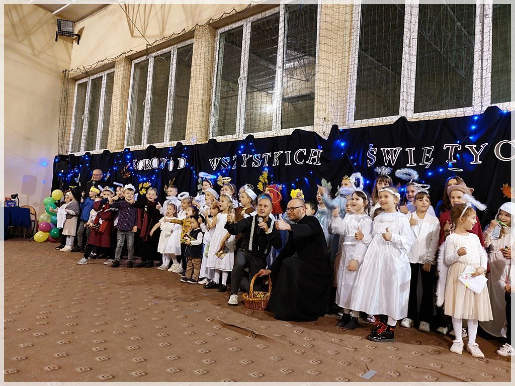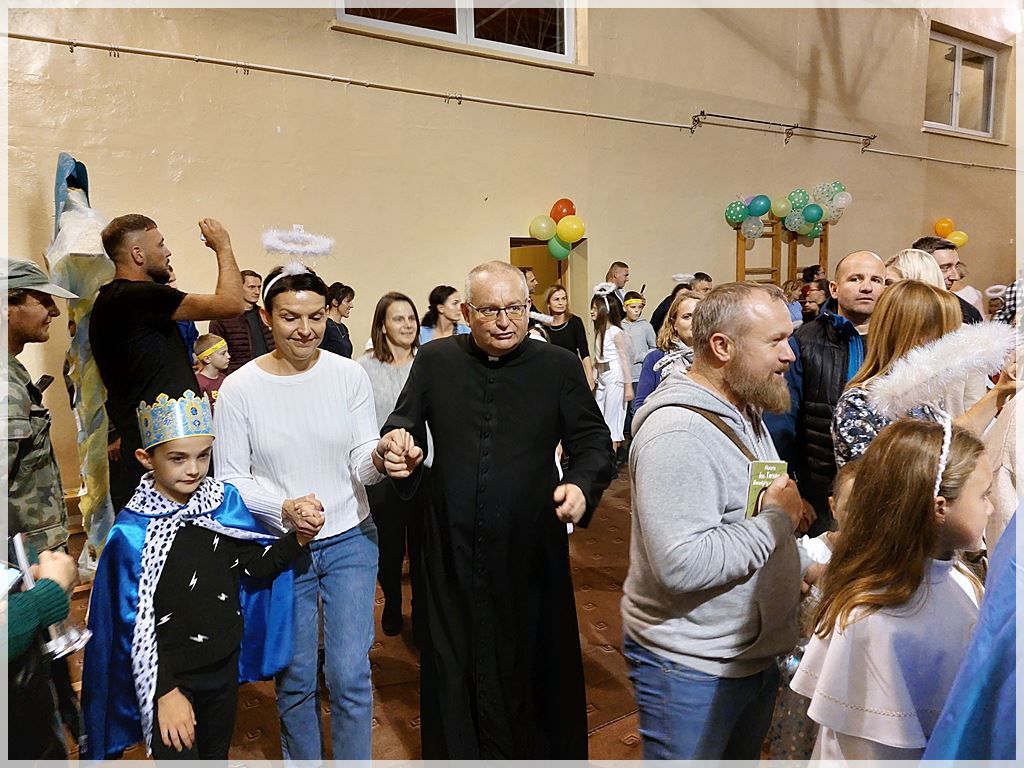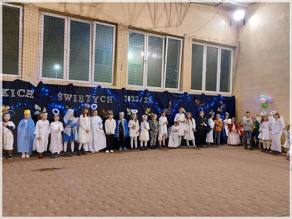 W Wigilię Święta Wszystkich Świętych - wieczorem odbyło się kościele krótkie nabożeństwo. Uczestniczyły w nim przebrane za aniołów i świętych dzieci wraz ze swymi rodzicami. Po skończonym nabożeństwie dzieci ustawiły się do pamiątkowego zdjęcia przy ołtarzu, gdzie otrzymały świecące opaski fluorescencyjne. Uformowany barwny korowód z zapalonymi latarkami i płonącymi pochodniami w dłoniach, przy radosnym śpiewie i akompaniamencie orkiestry przeszedł ulicami Kaźmierza do budynku szkoły podstawowej. Nad bezpieczeństwem czuwała Straż Pożarna oraz Policja. Na dziedzińcu naszej szkoły ks. Proboszcz Krzysztof Musiał powitał wszystkich zgromadzonych. Na salę gimnastyczną dzieci wchodziły przez symboliczną bramę „Niebo”. Po przejściu przez bramę ks. Mateusz Szkudlarek obficie częstował dzieci cukierkami, a Lenka, Nikola i Emilka wręczały książeczki o świętych dla dzieci.