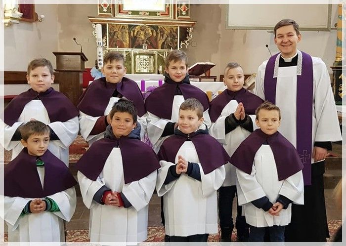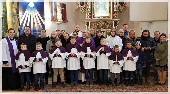 W I Niedzielę Adwentu 2 grudnia br. w naszej parafii odbyła się podniosła uroczystość przyjęcia 8 kandydatów do służby liturgicznej. Po Mszy świętej miało miejsce spotkanie i wspólna radość z nowo przyjętych ministrantów, a są nimi: Józef Paluszak, Dariusz Snela, Kamil Polus, Maksymilian Domaniecki, Mateusz Antkowiak, Dawid Łopata, Antoni Tomaszewski, Piotr Majek. W tym miejscu dziękuję wszystkim Rodzicom za pomoc i wsparcie w przygotowaniu tej wyjątkowej uroczystości. Naszym nowym ministrantom życzymy gorliwości w służbie Bożej! Króluj nam Chryste!