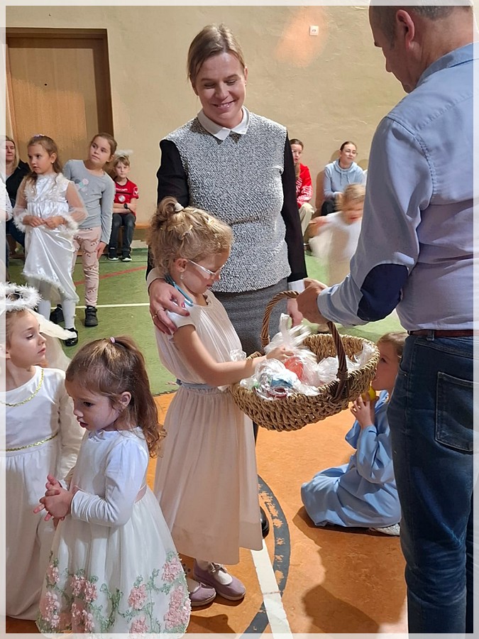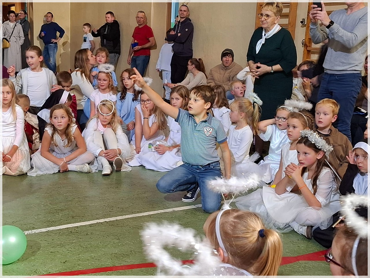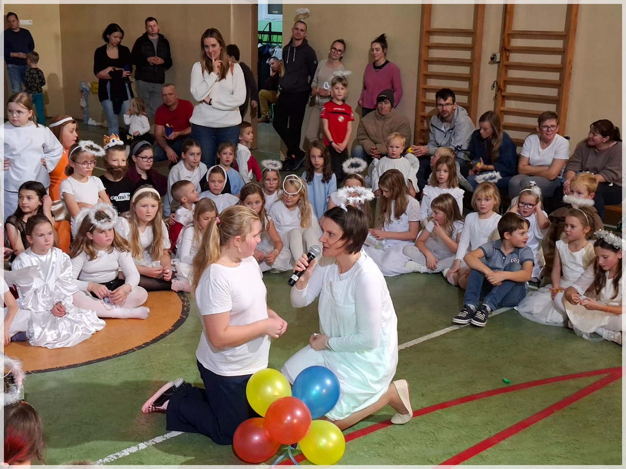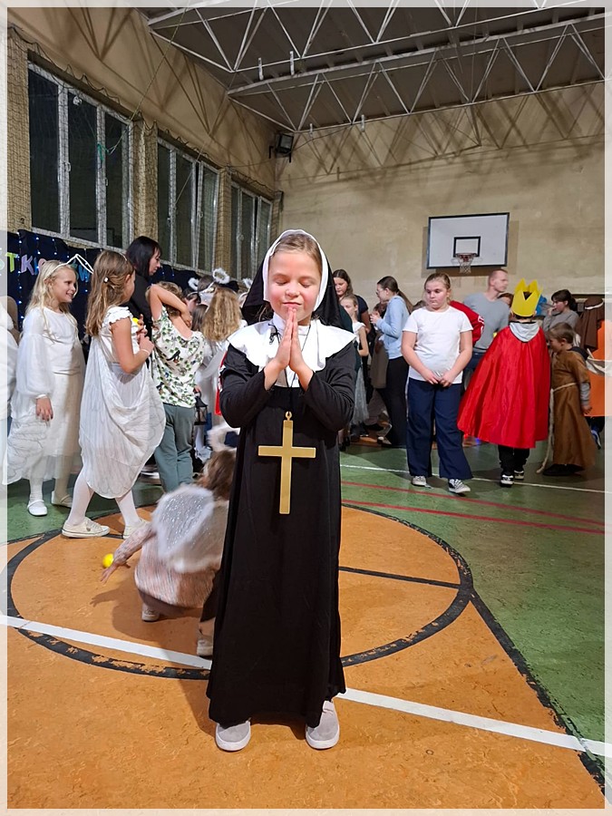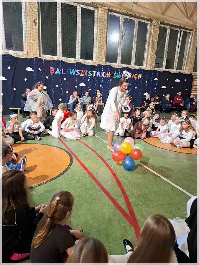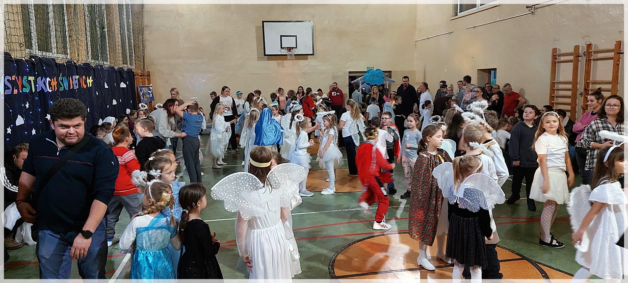 Na salę gimnastyczną dzieci wchodziły przez symboliczną bramę „Niebo”. Po przejściu przez bramę uczestnicy Korowodu Świętych zostali obficie obdarowani przez Wolontariuszy cukierkami, a także obdarowani podstawką korkową z napisem „Jesteśmy dziećmi Bożymi” oraz obrazkiem przedstawiającym św. Carlo Acutis. Na pięknie udekorowanej sali uczestników serdecznie powitała p. Dyrektor Szkoły Krzysztofa Stankiewicz-Wajde. Dzieci pięknie przebrane za świętych radośnie tańczyły przy oprawie muzycznej przygotowanej przez Pana Roberta Winieckiego i Panią Dominikę Nowaczyk. Podczas przerwy w świetlicy uczestnicy mogli częstować się pysznymi ciastami, słodyczami, słonymi przekąskami i napojami oraz zrobić sobie zdjęcie w pamiątkowej ramie z napisem: „Każdy może być święty.” Korowód był okazją dla uczestników poznania własnych patronów czy świętych Kościoła. Mogliśmy spotkać między innymi aniołki, Maryję, św. Urszulę, św. Różę, św. Zuzannę, św. Monikę, św. Helenę, św. Faustynę, św. Józefa, św. Henryka, św. Brata Alberta, św. Antoniego, św. Jana Bosko, św. Józefa, św. Franciszka i wielu innych świętych. Wydarzeniu temu towarzyszyła wspaniałą atmosfera, mnóstwo uśmiechu, a co bardzo ważne czas wspólnie spędzony na zabawie przez rodziców z dziećmi. Tegoroczny Korowód i Bal Wszystkich Świętych zapewne pozostanie na długo w pamięci uczestników. Aby ten bal był tak wspaniały przysłużyło się wiele cudownych Rodziców i właścicieli firm i osób, którym nie było obojętne nasze wezwanie o pomoc w organizacji Korowodu i Balu Wszystkich Świętych z całego serca DZIĘKUJEMY życząc wiele błogosławieństwa w życiu.