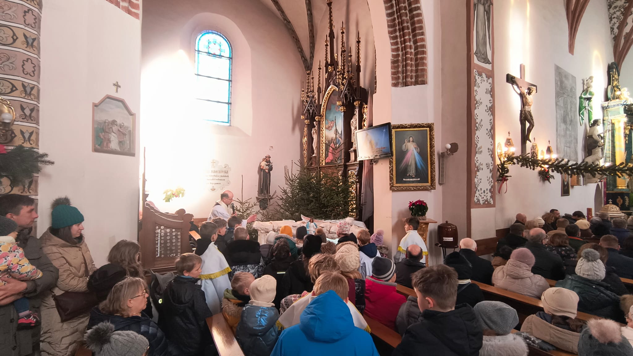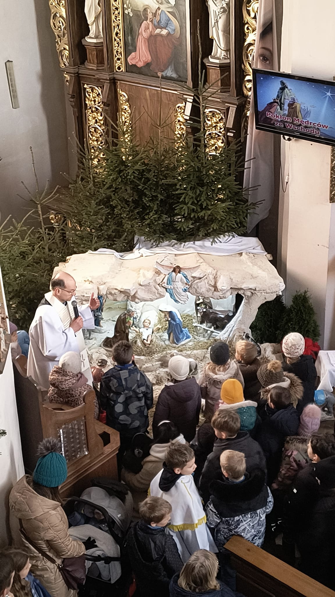 Podczas Mszy Świętej o godz. 10:45, sprawowanej przez ks. Mikołaja Konarskiego, wspólnie z dziećmi przeżywaliśmy Uroczystość Objawienia Pańskiego. Nawiązując do Ewangelii o Mędrcach ze Wschodu, Ksiądz Proboszcz zaprosił dzieci do żłóbka i ołtarza, przybliżając im postacie Trzech Króli. Troje chłopców z zaangażowaniem przeniosło figurki Kacpra, Melchiora i Baltazara do żłóbka - był to piękny i wzruszający znak drogi wiary prowadzącej do Chrystusa. Na zakończenie chłopcy zostali zaproszeni do rozważenia służby ministranckiej. Po Mszy Świętej kapłani udzielili dzieciom indywidualnego błogosławieństwa, a każde dziecko otrzymało list od papieża Leona jako podziękowanie za udział w roratach. Dziękujemy dzieciom i rodzicom za wspólne budowanie żywego Kościoła. Niech przykład Trzech Króli uczy nas podążania za światłem Chrystusa.